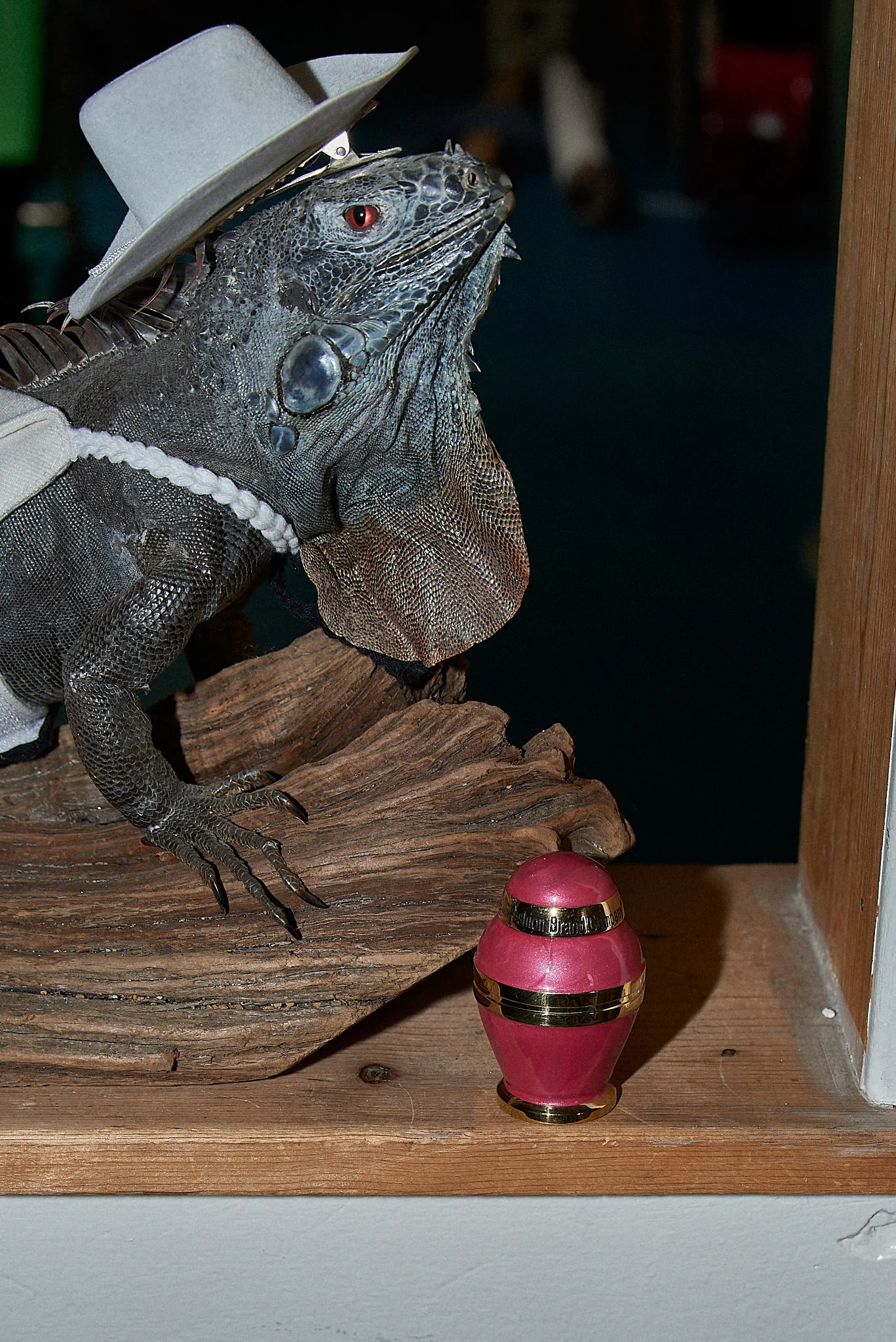 We are very sorry for your loss. Here is a tiny urn for the remains of your scaly friend. Custom made and designed Metal urn with pink enamel and glossy finish. The top twists off and reads "fashion brand company". Ashes to ashes. Dust to dust.